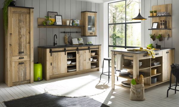 Küche mit Kochinsel "Stove", Used Wood hell und anthrazit, 6-teilig