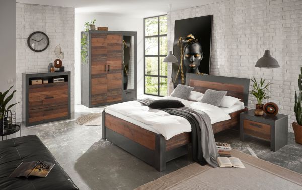 Schlafzimmer komplett "Ward" in Old Used Wood Shabby Design mit Matera grau Komplettzimmer mit Bett, Kleiderschrank, Kommode und Nachttisch