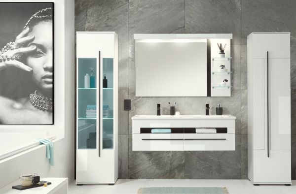 Badmöbel Set "Design-D" in weiß Hochglanz und schwarz Badkombination MIT Doppelwaschbecken und LED Beleuchtung 120 x 200 cm