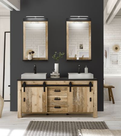 Badmöbel Set "Stove" in Used Wood hell und anthrazit Doppelwaschtisch MIT Waschbecken und LED Spiegellampe