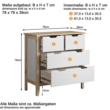 Kommode "Latera" in Massivholz Kiefer weiß lackiert Wohn- und Esszimmer Schubladenkommode 78 x 79 cm