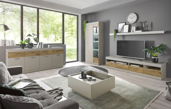 Vitrine "Griego" in Kieselgrau matt und Zinneiche Wohn- und Esszimmer Vitrinenschrank halbhoch 90 x 139 cm
