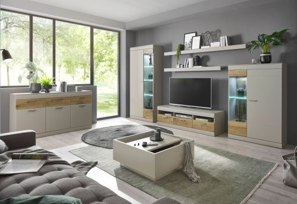 Wohnwand "Griego" in Kieselgrau matt und Zinneiche Wohnkombination 4-teilig 350 x 170 cm