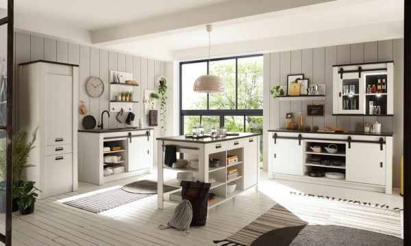 Küchenschrank "Stove" in weiß Pinie und anthrazit Landhaus Küche Unterschrank für Spüle oder Kochfeld 133 x 93 cm