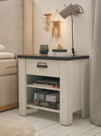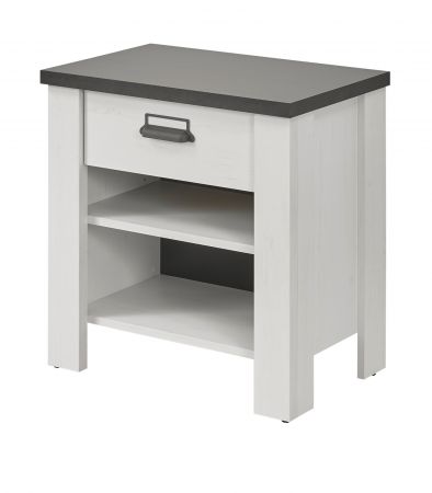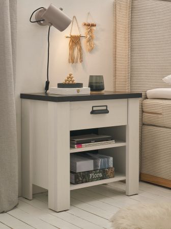 Nachttisch "Stove" in weiß Pinie und anthrazit Landhaus Nachtkommode mit Schubkasten in Komforthöhe 60 x 61