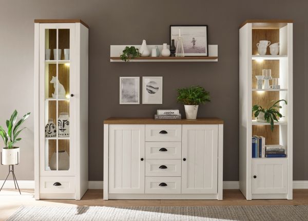 Wohnwand "Seyne" in weiß Pinie und Eiche hell Landhaus Wohnkombination 4-teilig 270 x 198 cm