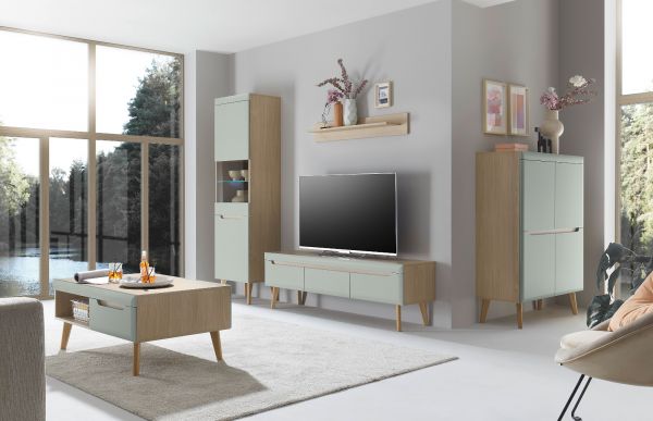 Vitrine "Isgard" in Pistazie matt und Scandi Eiche Vitrinenschrank skandinavisch 53 x 197 cm