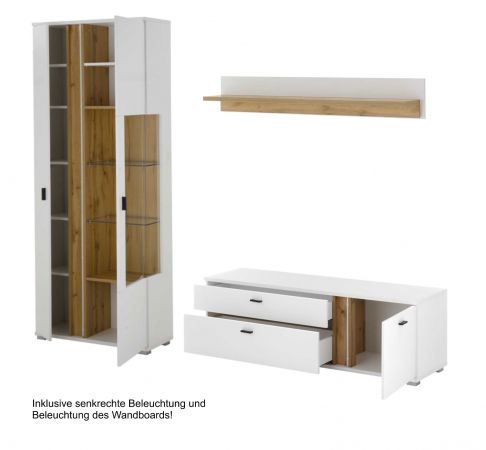 Wohnwand "Bellport" in weiß matt und Wotan Eiche Wohnkombination inklusive Frontbeleuchtung 240 x 200