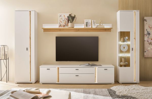 Wohnwand "Bellport" in weiß matt und Wotan Eiche Wohnkombination inklusive Frontbeleuchtung 330 x 200